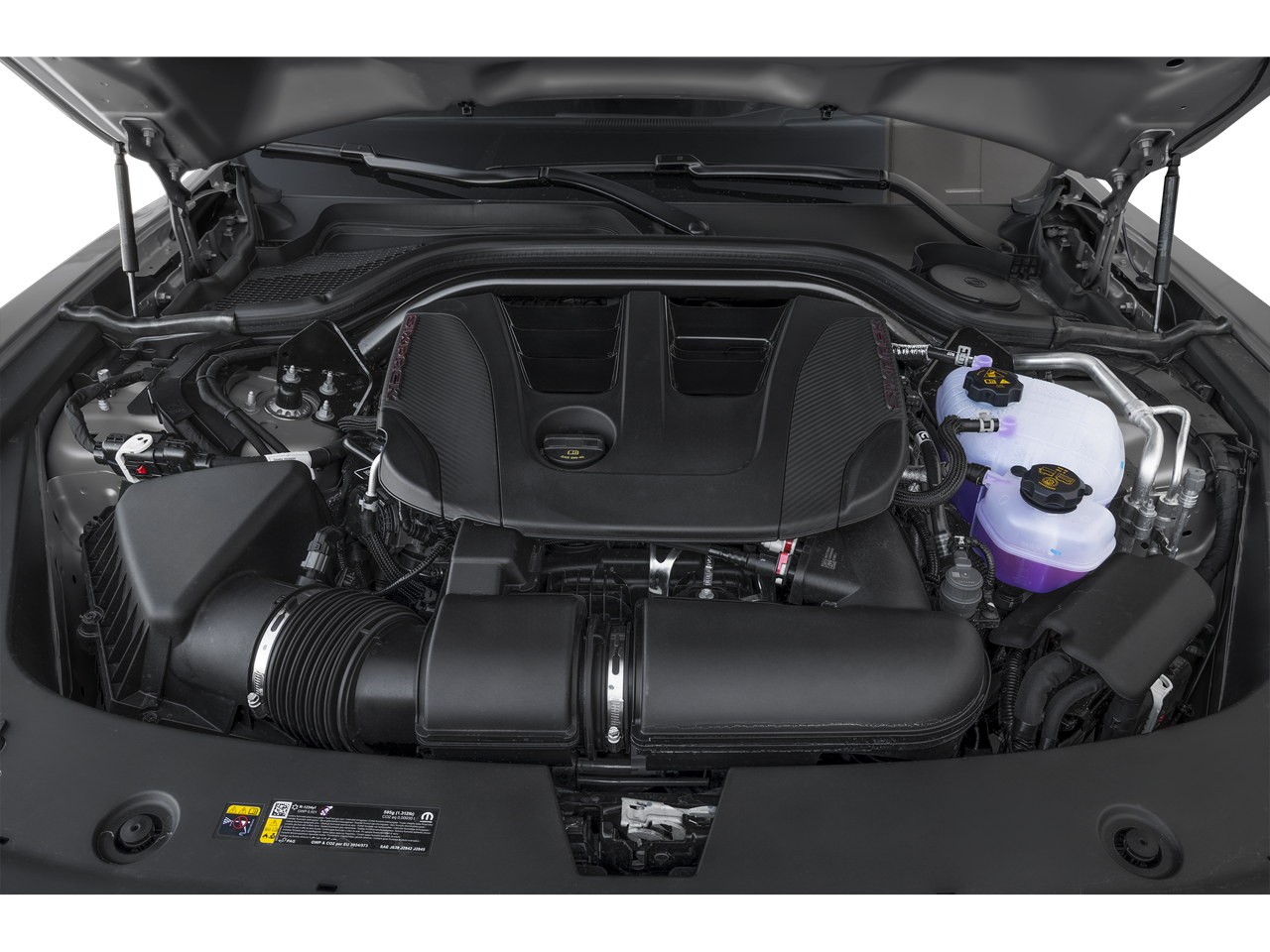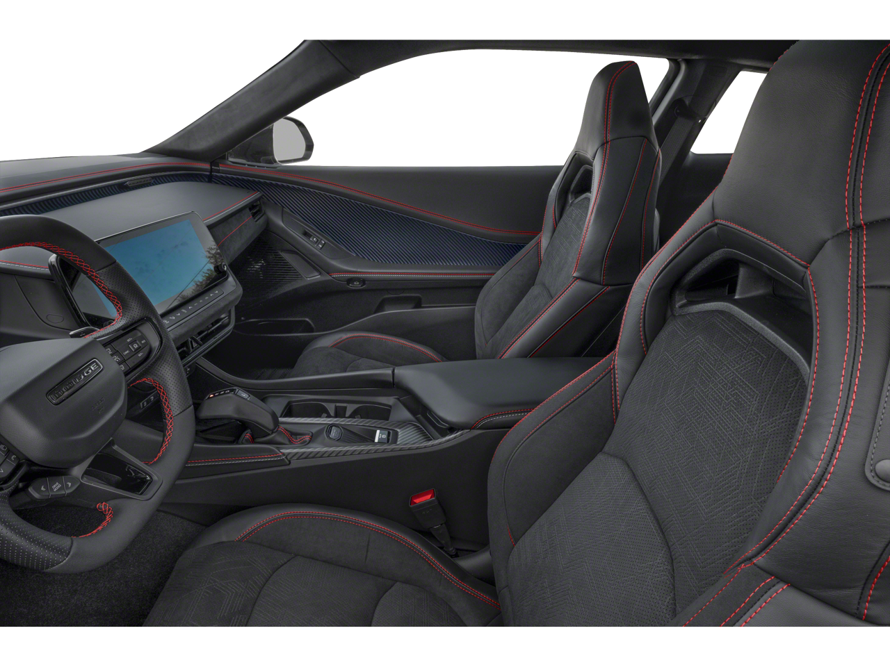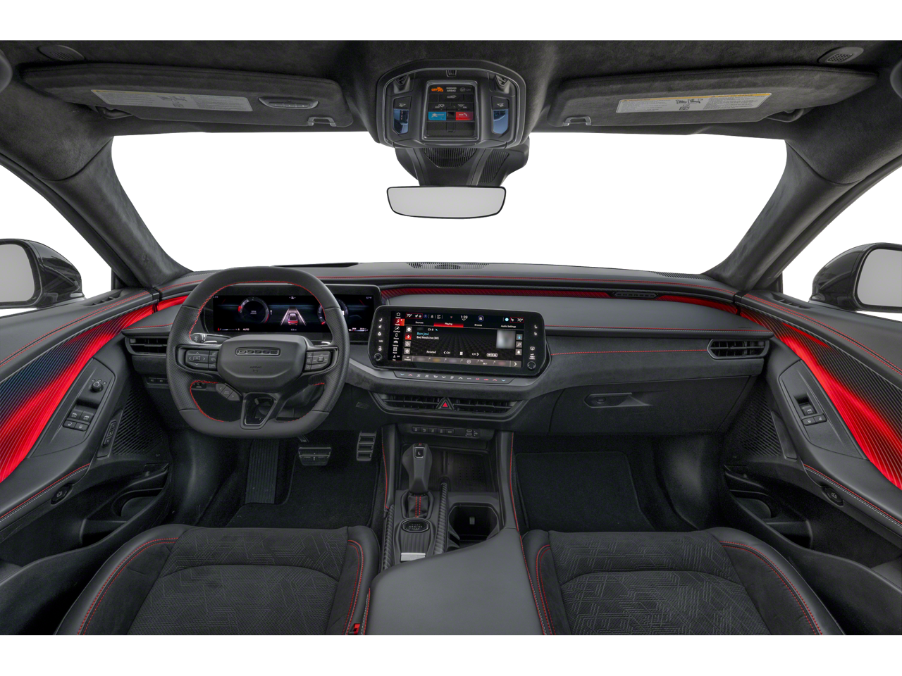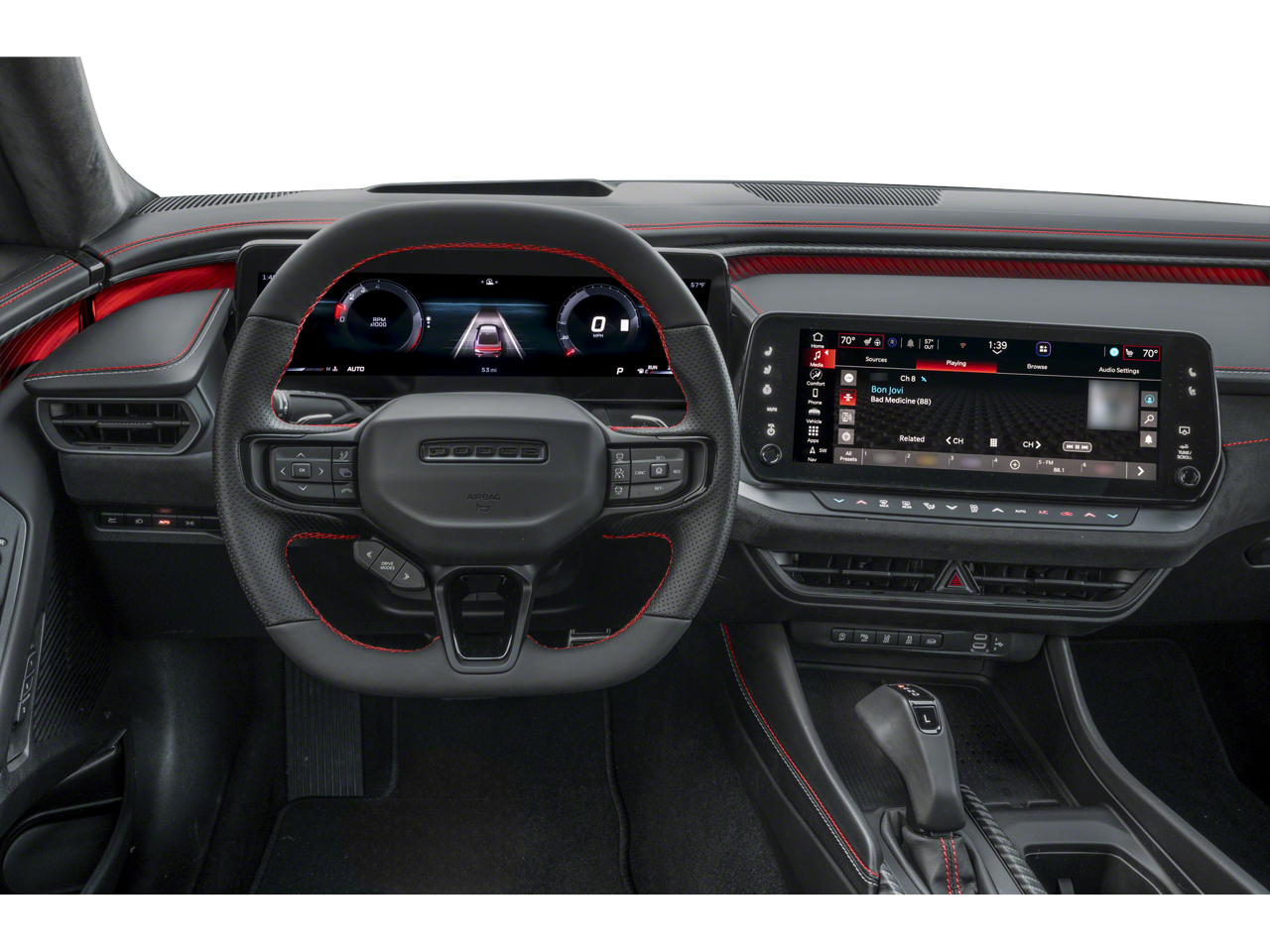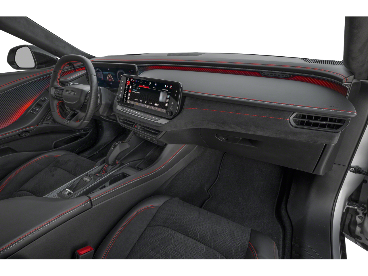 The Scat Pack cabin is arranged around the driver with heated cloth sport front seats, an eight-way power driver's seat, a heated leather steering wheel, dual-zone automatic climate control, bright pedals, keyless entry with push-button start, and remote start. Technology highlights include an 8.4-inch touchscreen with voice recognition, Android Auto®, Apple CarPlay®, Bluetooth®, available WiFi compatibility with a required subscription, and an Alpine audio system.
