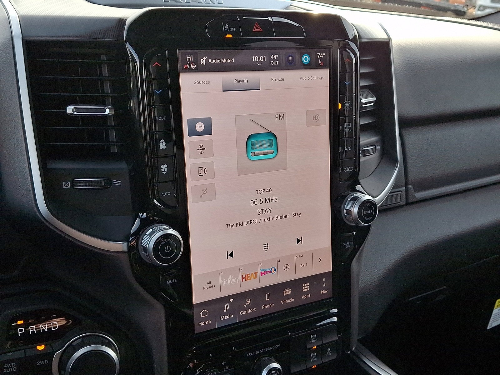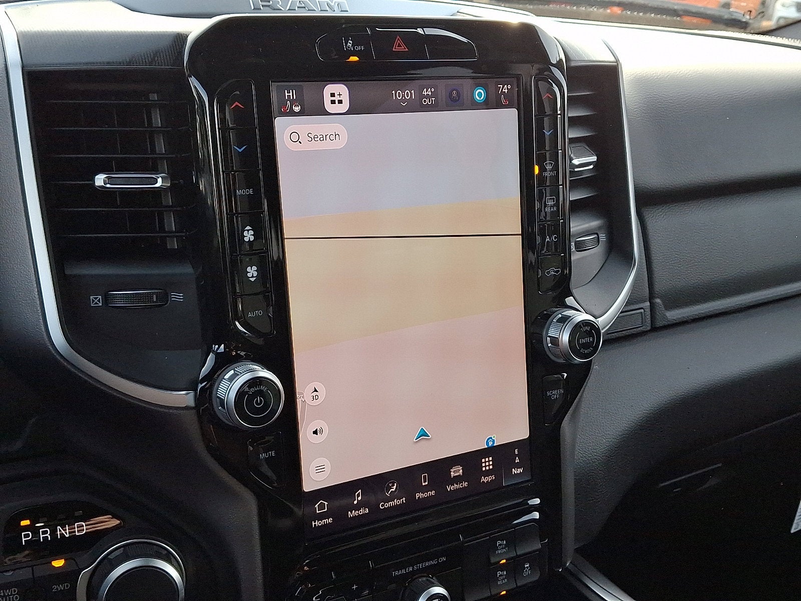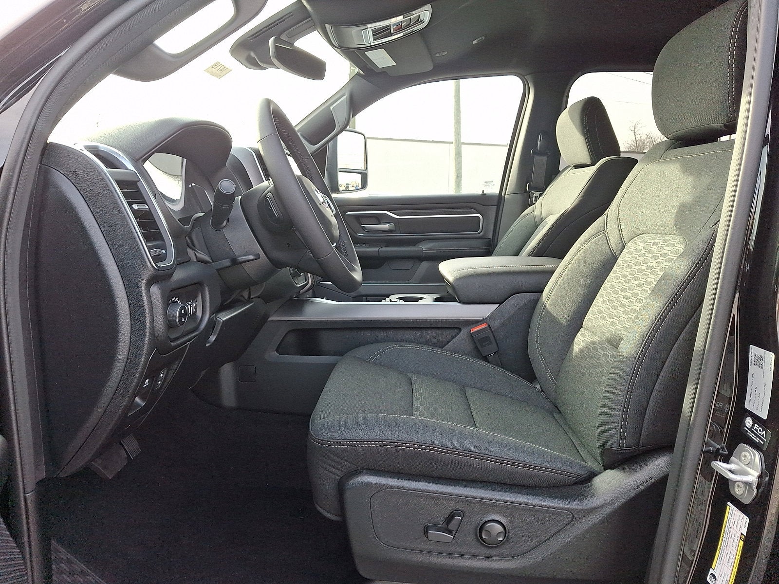 Our Big Horn cabin has been tailored to fit your needs, with the Level 2 Equipment Package's heated deluxe cloth seats, a heated leather-wrapped steering wheel, universal home remote, power adjustable pedals, power sliding rear window, dual climate control, a RAM Clean-Air System, keyless access, push-button ignition, cruise control, door-sill scuff plates, and clever cargo space, and a Uconnect® 5 with 12.0-inch touchscreen features voice control, Bluetooth®, and a nine-speaker sound system for intelligent infotainment.