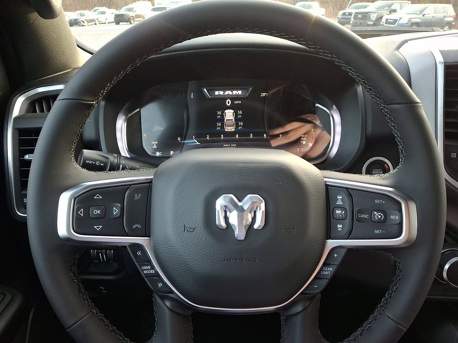 Our Big Horn cabin has been tailored to fit your needs, with the Level 2 Equipment Package's heated deluxe cloth seats, a heated leather-wrapped steering wheel, universal home remote, power adjustable pedals, power sliding rear window, dual climate control, a RAM Clean-Air System, keyless access, push-button ignition, cruise control, door-sill scuff plates, and clever cargo space, and a Uconnect® 5 with 12.0-inch touchscreen features voice control, Bluetooth®, and a nine-speaker sound system for intelligent infotainment.