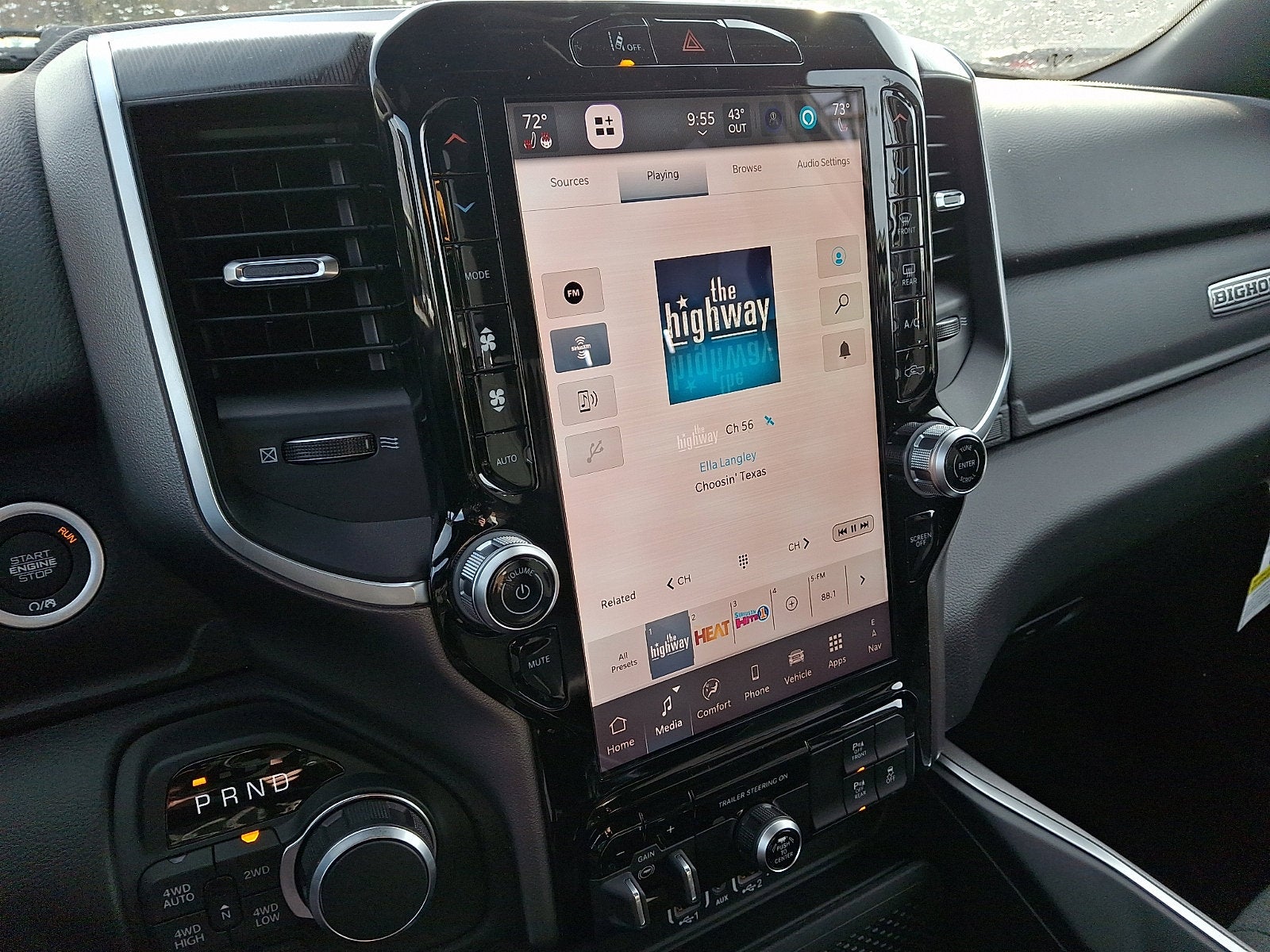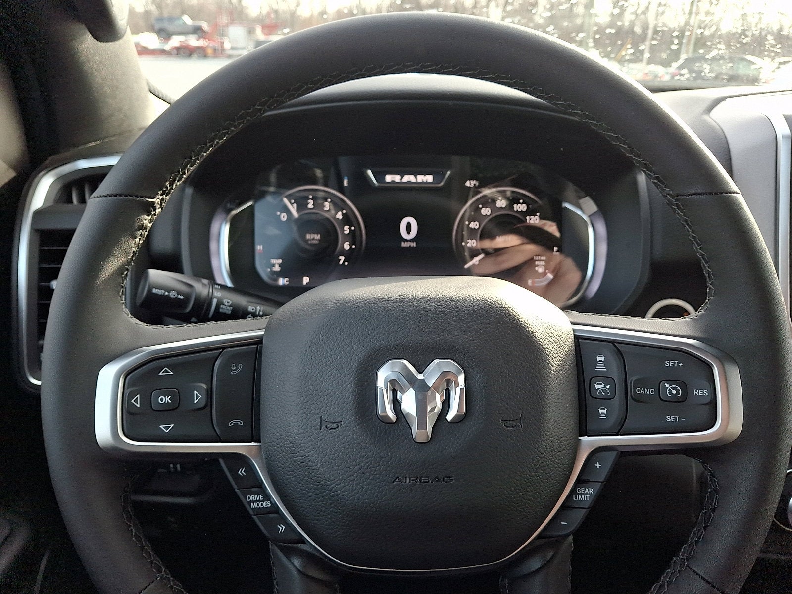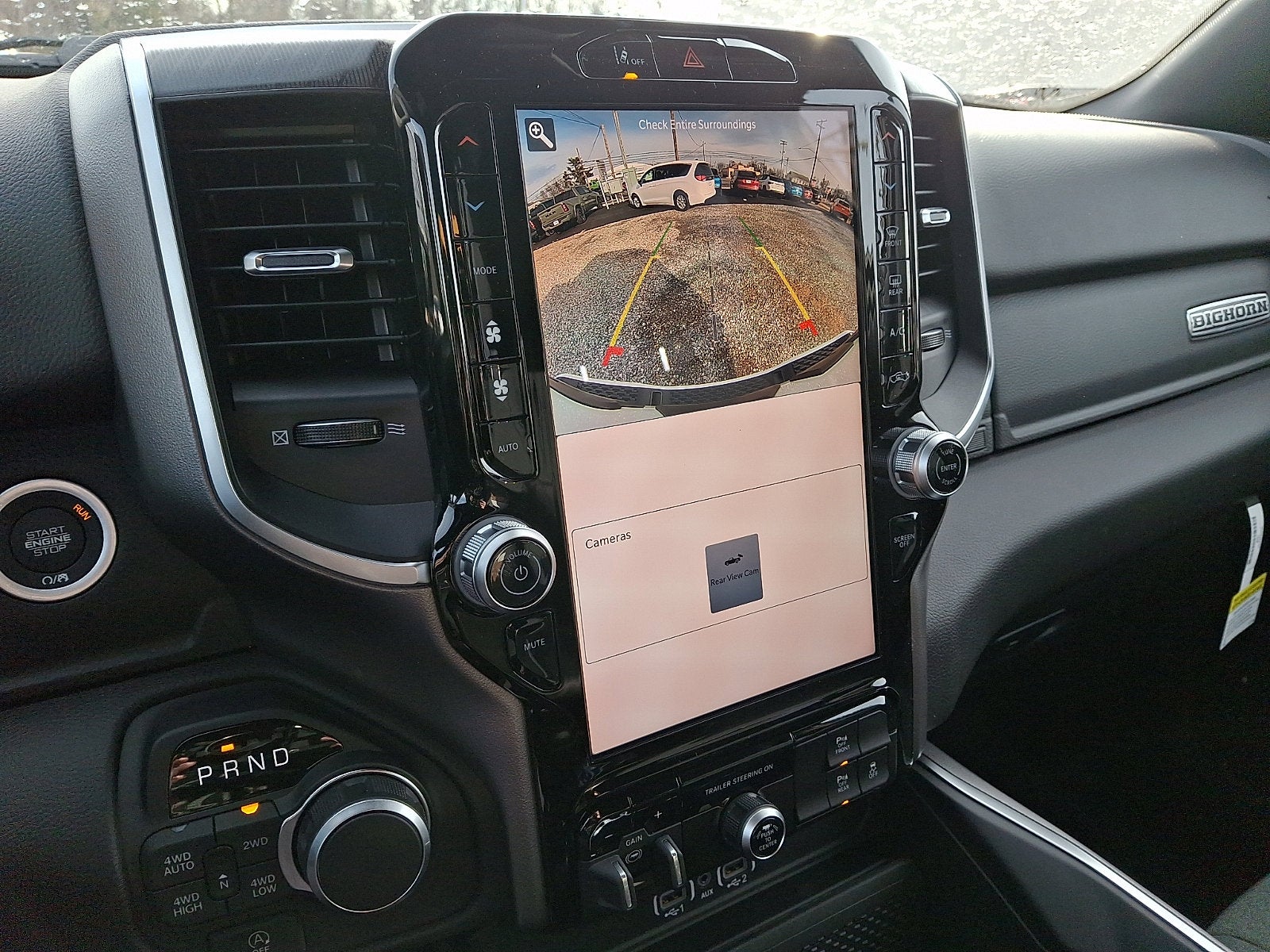 Our Big Horn cabin has been tailored to fit your needs, with the Level 2 Equipment Package's heated deluxe cloth seats, a heated leather-wrapped steering wheel, universal home remote, power adjustable pedals, power sliding rear window, dual climate control, a RAM Clean-Air System, keyless access, push-button ignition, cruise control, door-sill scuff plates, and clever cargo space, and a Uconnect® 5 with 12.0-inch touchscreen features voice control, Bluetooth®, and a nine-speaker sound system for intelligent infotainment.